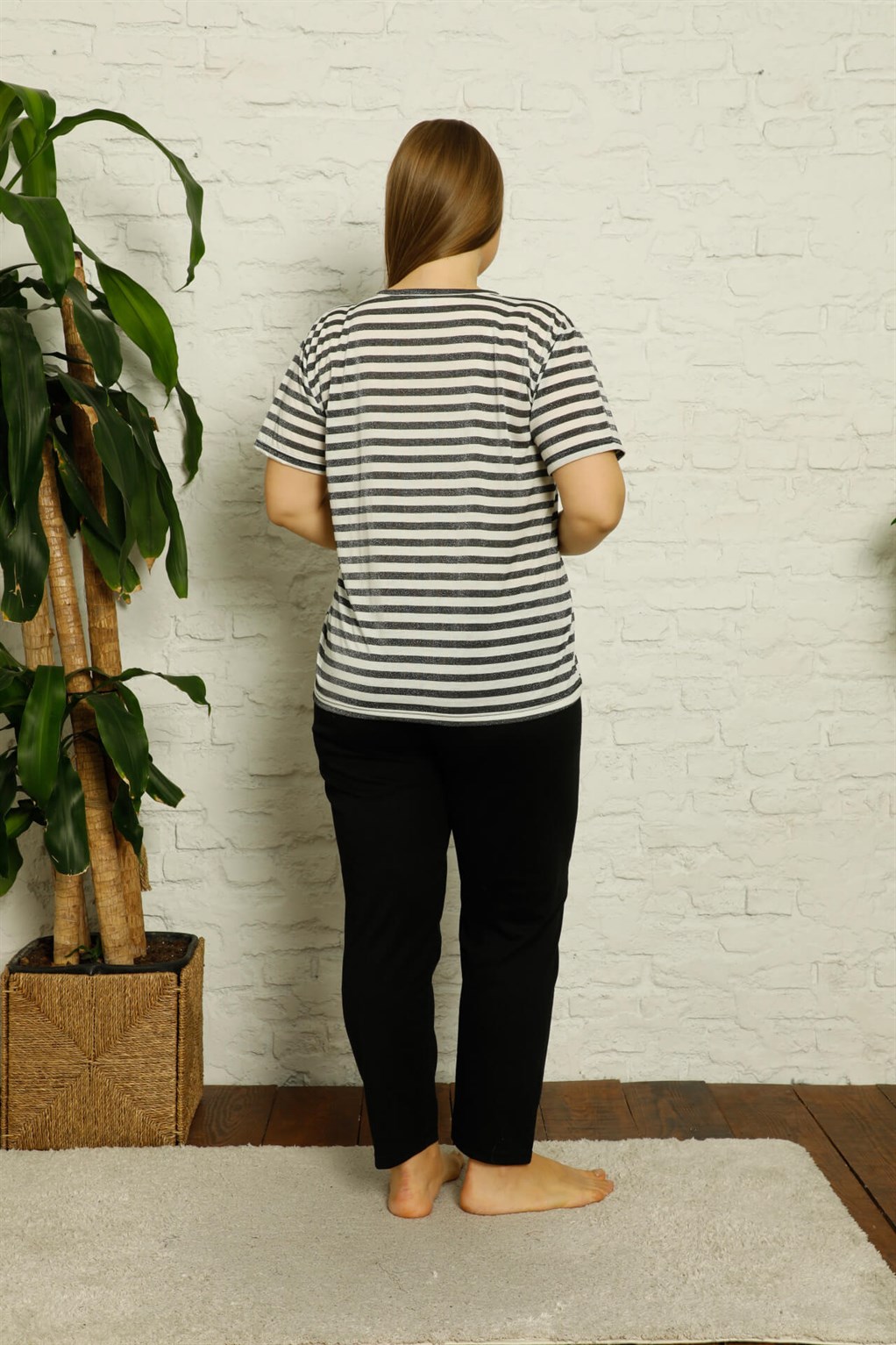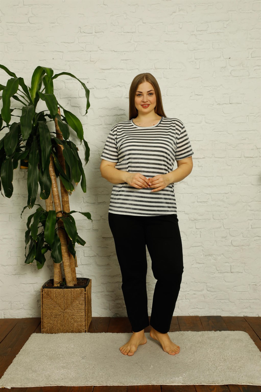 Moda Çizgi Kadın %100 Pamuk Kısa Kol Büyük Beden Pijama Takım 202133