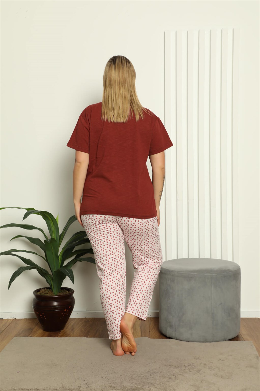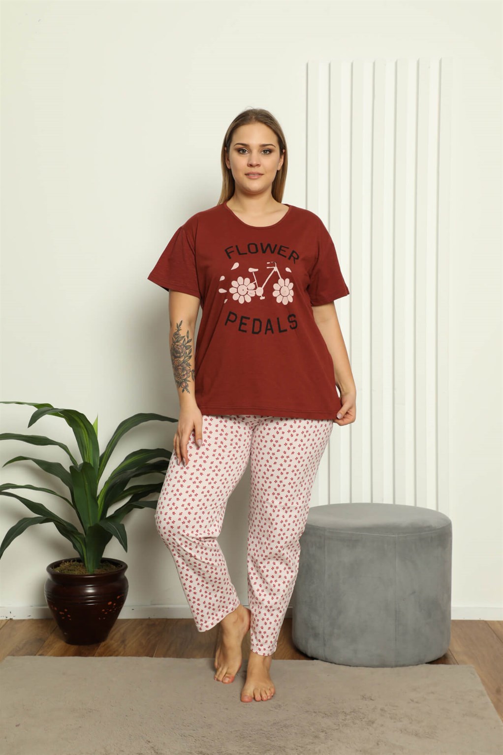 Moda Çizgi Kadın %100 Pamuk Kısa Kol Büyük Beden Pijama Takım 202147