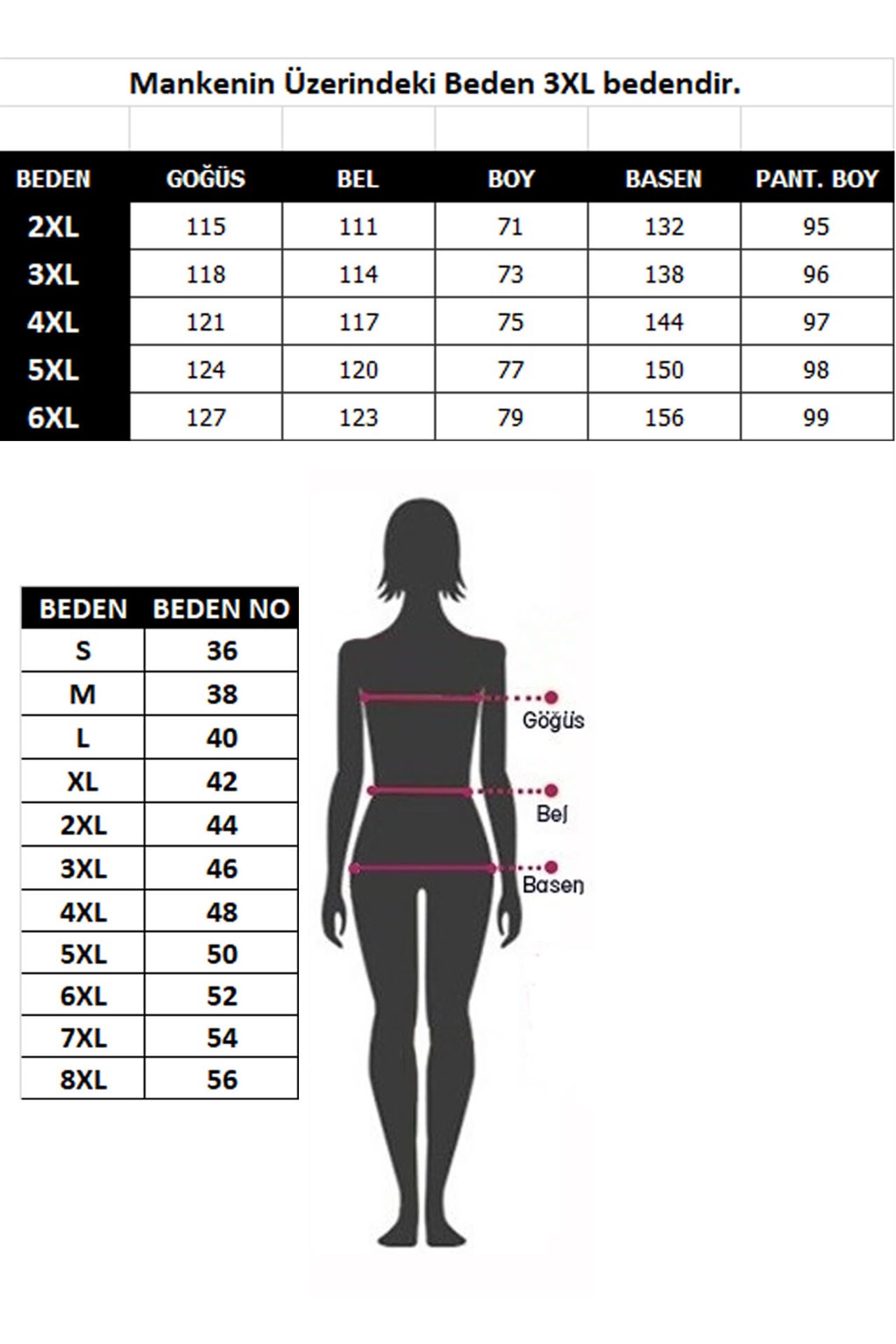 Mankenin üzerindeki beden 3XL bedendir.