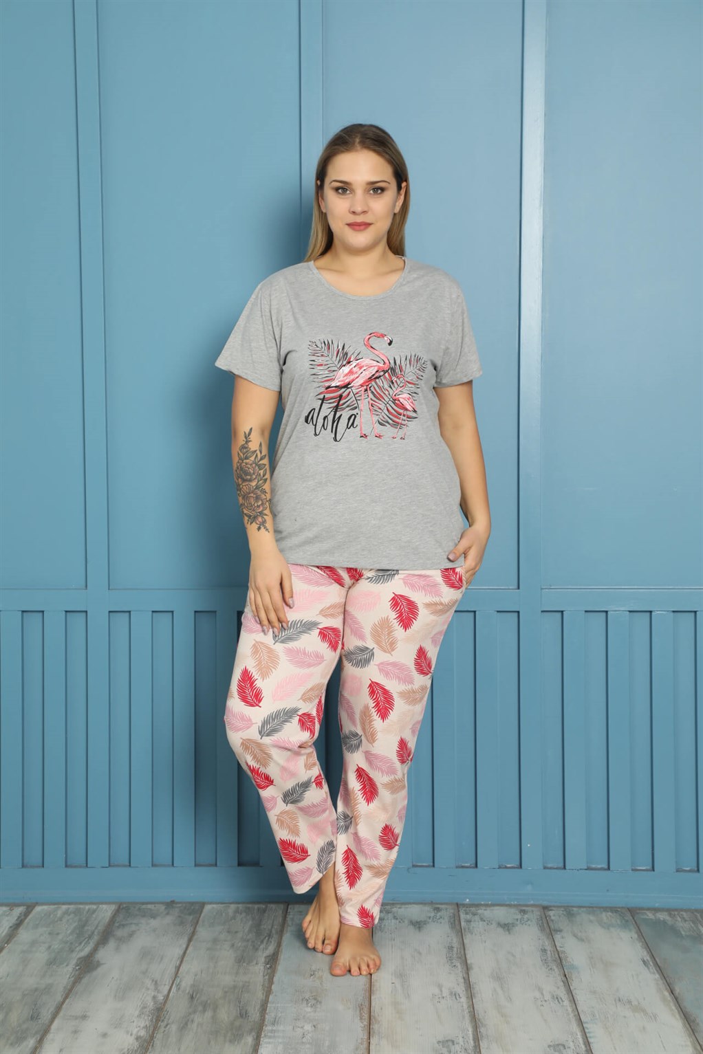 Moda Çizgi Kadın %100 Pamuk Kısa Kol Büyük Beden Pijama Takım 202154