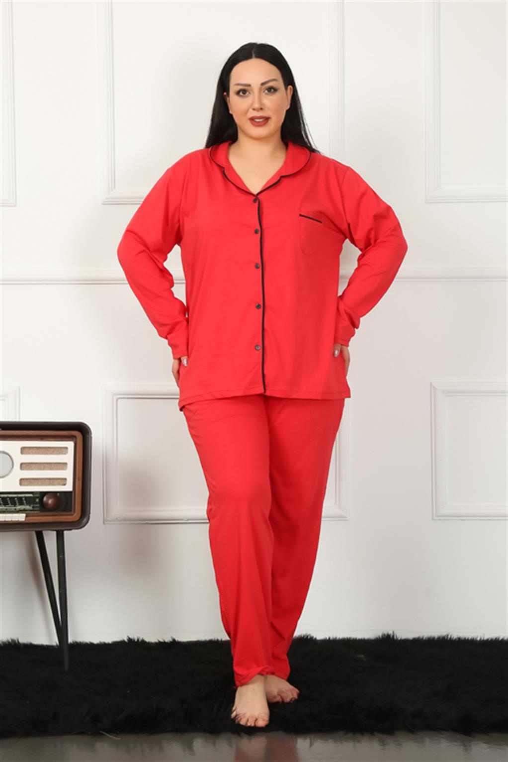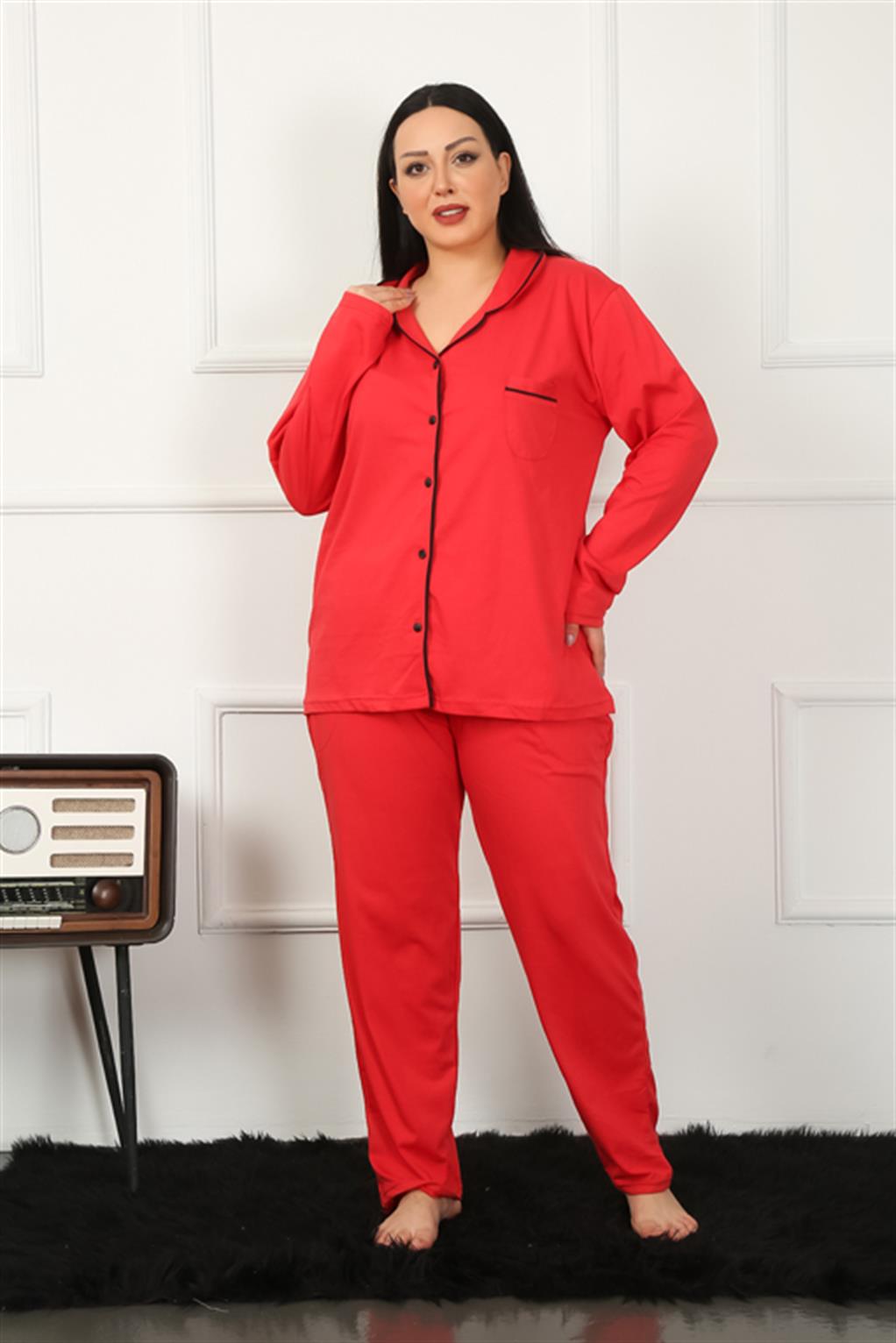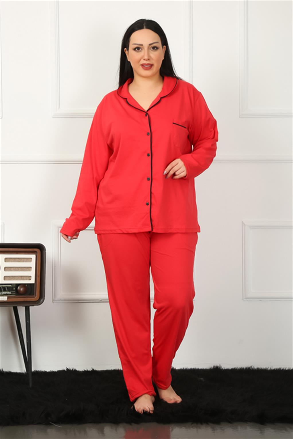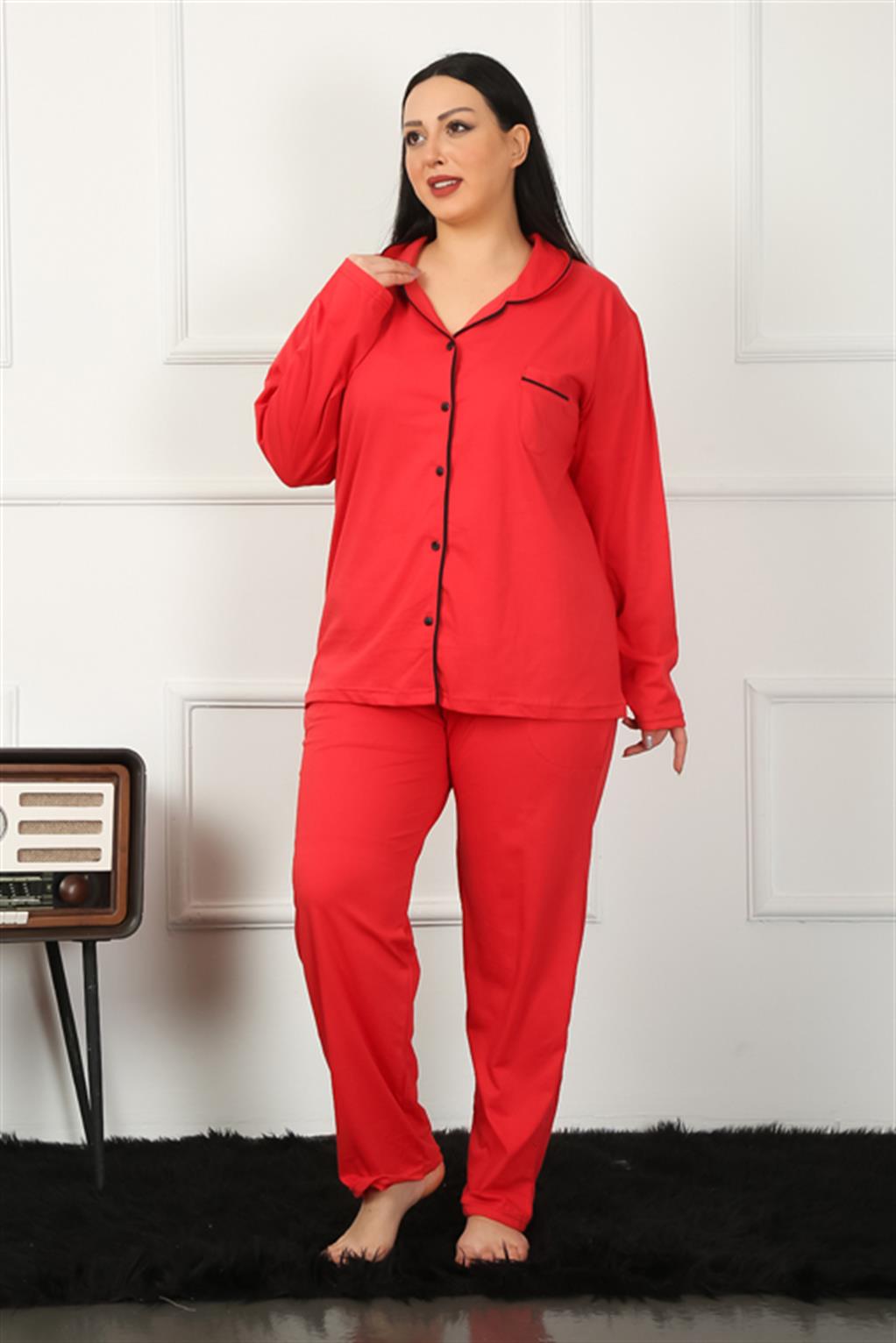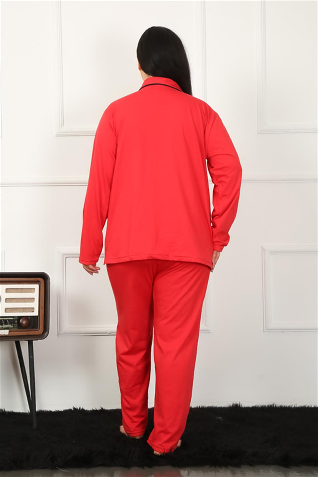 Moda Çizgi Kadın Büyük Beden Önden Düğmeli Kırmızı Pijama Takım 202185