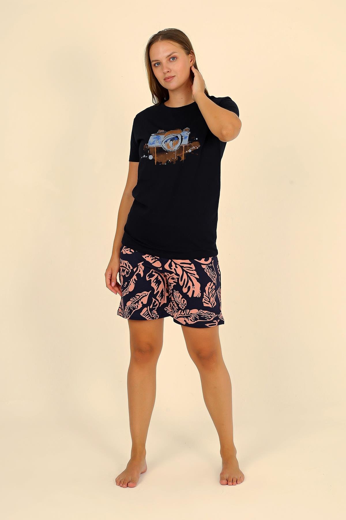 Moda Çizgi Kadın Şortlu Kısa Kol Penye Pijama Takımı Siyah 3623